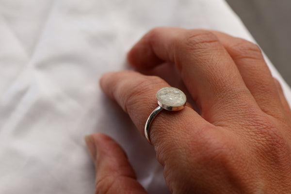 The Extra Large Oval Celebration Ring has a 10x12 oval setting infused with cremation ash. This half round band comes in sterling silver or 14K gold filled and has a shiny finish, perfect for stacking.