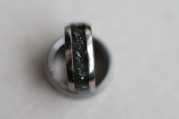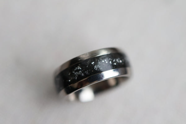 8mm wide with 4mm channel titanium ring. A perfect setting for ashes and also is a great option to show hair or fur or sentimental items like sand, flowers, fibres or any small material.
