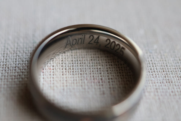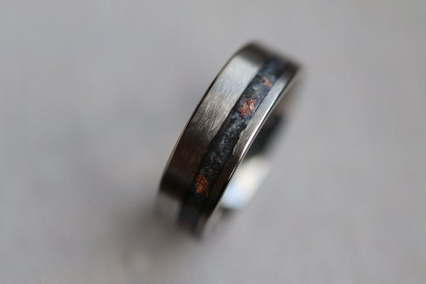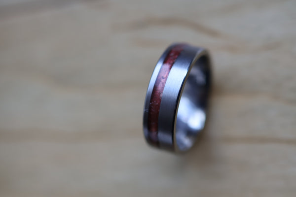 8mm wide with offset 2.5mm channel titanium ring. A perfect setting for ashes and also is a great option to show hair or fur or sentimental items like sand, flowers, fibres or any small material.